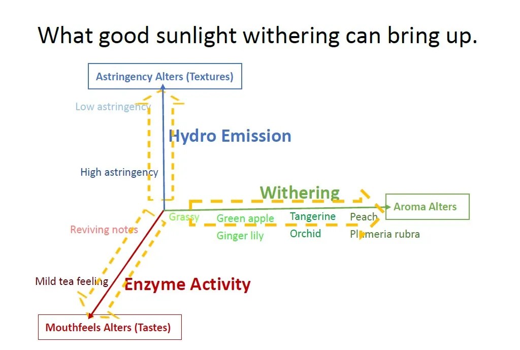 The anchor of the quality lies in withering, which can be divided into two sections: sunlight withering & indoor withering, and the former one is the key. It goes without saying that, in our concepts, good flavors won’t be obtained without sunlight; just considering how the developments of any creatures without sunlight will look like, then we will know the importance. The sunlight provides all necessary conditions to make good teas: moisture emission along with the breeze, withering and enzyme activities are all triggered by sun; such the method also appears in Japanese green tea making processes called ichō. In short, the proper sunlight withering is the best agent to initiate flavor transformation comprehensively to create aromas & mild tastes as long as reducing astringency. (See 3 yellow arrows in the chart)